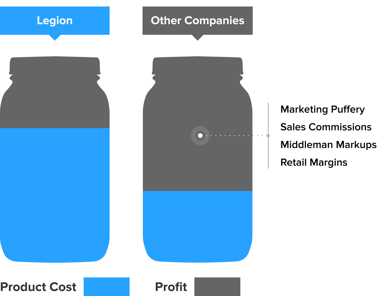 Legion is different. We cut out the middlemen and shenanigans so we can spend more on what really matters: making superior products with all-natural and clinically effective ingredients and dosages.